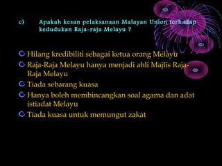 Menentang penghakisan kuasa Raja-Raja melayu. A Sebab-Sebab Orang Melayu Menentang Malayan Union. Sejarah Bab 4 Tingkatan 4.